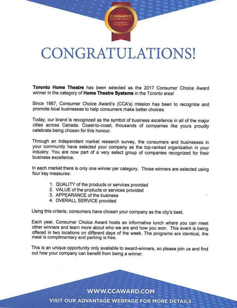 Toronto Home Theater has been selected as the 2017 Consumer Choice Award winner in the category of Home Theater Systems in the Toronto area! Since 1987, Consumer Choice Award’s (CCA’s) mission has been to recognize and promote local businesses to help consumers make better choices.